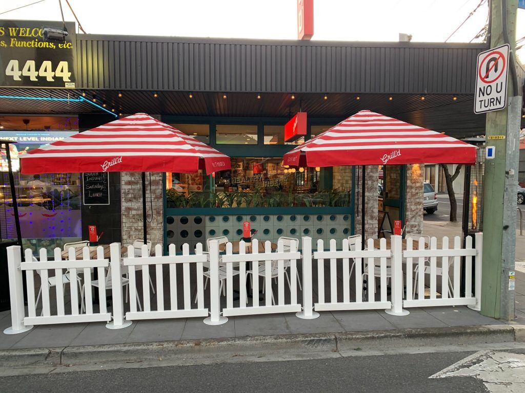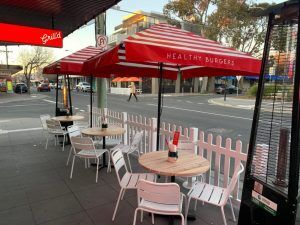 Instant Shade Umbrellas were involved in the fit out of Grill’d Burger’s newest restaurant. We supplied branded cafe series outdoor umbrellas which make a bold statement in this bustling precinct.