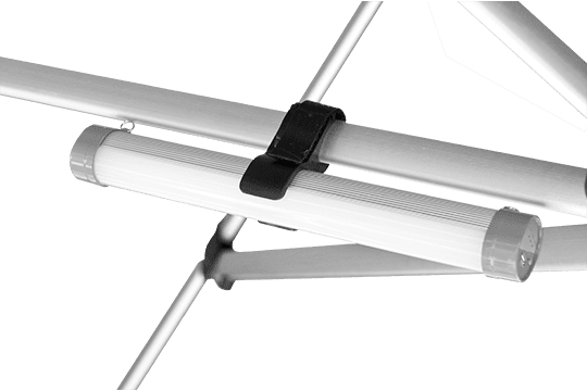 Our rechargeable LED lights comes with matching clips to attach the light to the canopy frame on any location on the arms of the umbrella. You will need to plug in and charge the batteries before use and should last approx 6 hours.