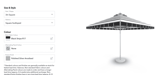 NOTE that only standard colours are available ex-stock for quick delivery. Non-standard fabric colours and customisations like valances are made to order with 4-6 week lead time and non-standard frame finishes can have an 8-12 week lead time. You’ll be advised of lead times and extra charges when you submit your enquiry.