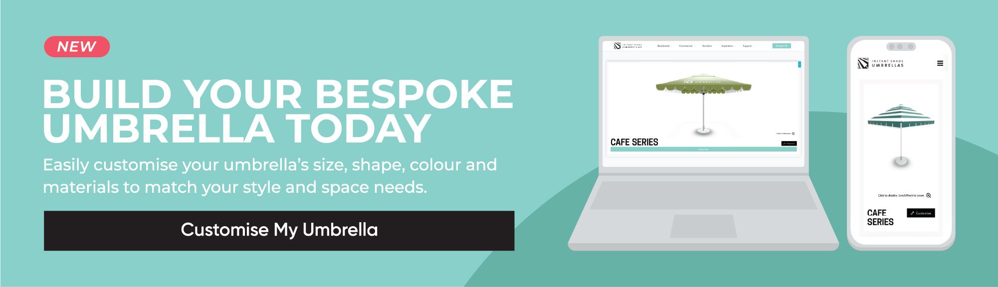 Check out our new and innovative customisable outdoor umbrella builder. A game-changer in personalizing your shade experience. This cutting-edge tool allows you to design the perfect umbrella solution for your space. Customise a variety of umbrella options including size, shape, color, and materials.