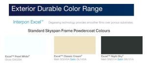 Skyspan frames are powdercoated in your choice of Interpon colours. The degrassing technology of Interpon colours mean smoother fills over porous substrates and excellent colour retention. With over 30 colours to choose from you are bound to find the perfect one for your umbrella.Click here to see the full colour range