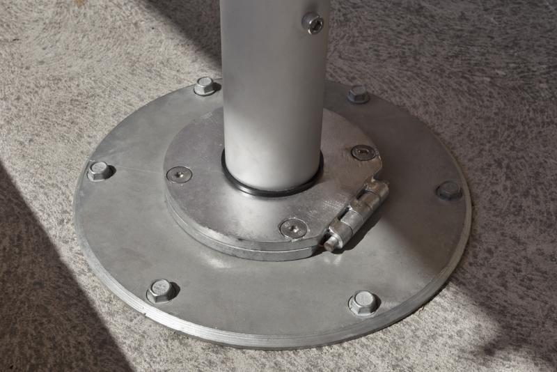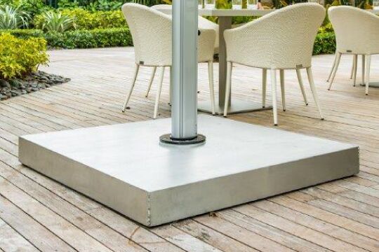 The sleek aluminium cover hides to 8 concrete pavers 500mm x 500mm (pavers not included). This type of base is suitable for light winds only.